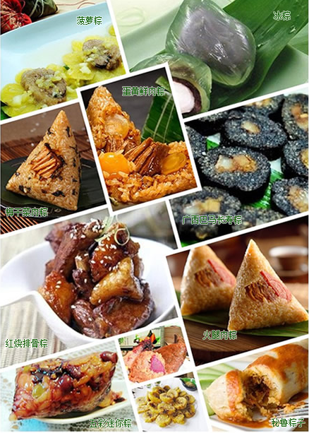 如今的粽子更是多种多样,璀璨纷呈。现今各地的粽子,一般都用箬壳包糯米,但内含的花色则根据各地特产和风俗而定,著名的有桂圆粽、肉粽、水晶粽、莲蓉粽、蜜饯粽、板栗粽、辣粽、酸菜粽、火腿粽、咸蛋粽等等。
