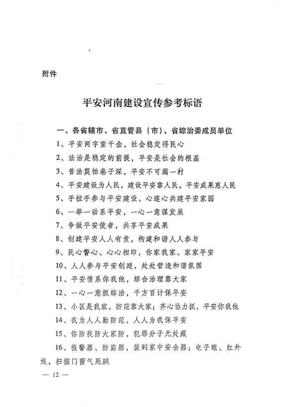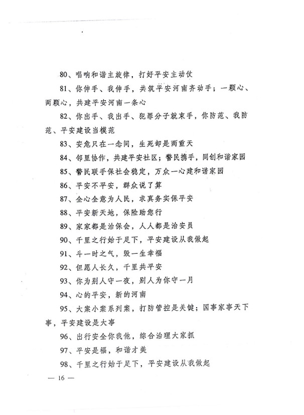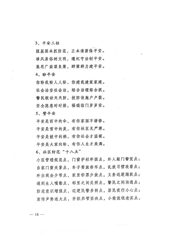 平安两字重千斤,社会稳定得民心。 创建平安人人有责,构建和谐人人参与。