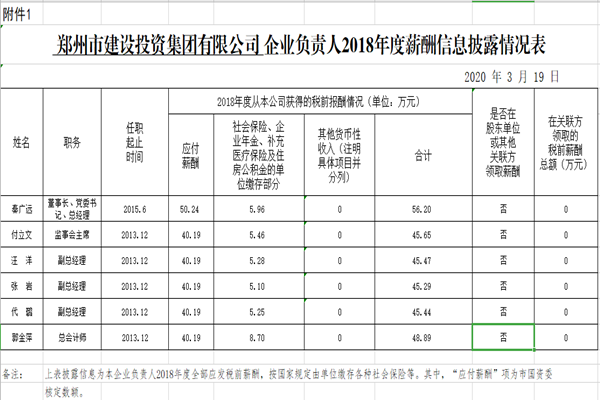 郑州市建设投资集团有限公司企业负责人2018年度薪酬信息披露情况表